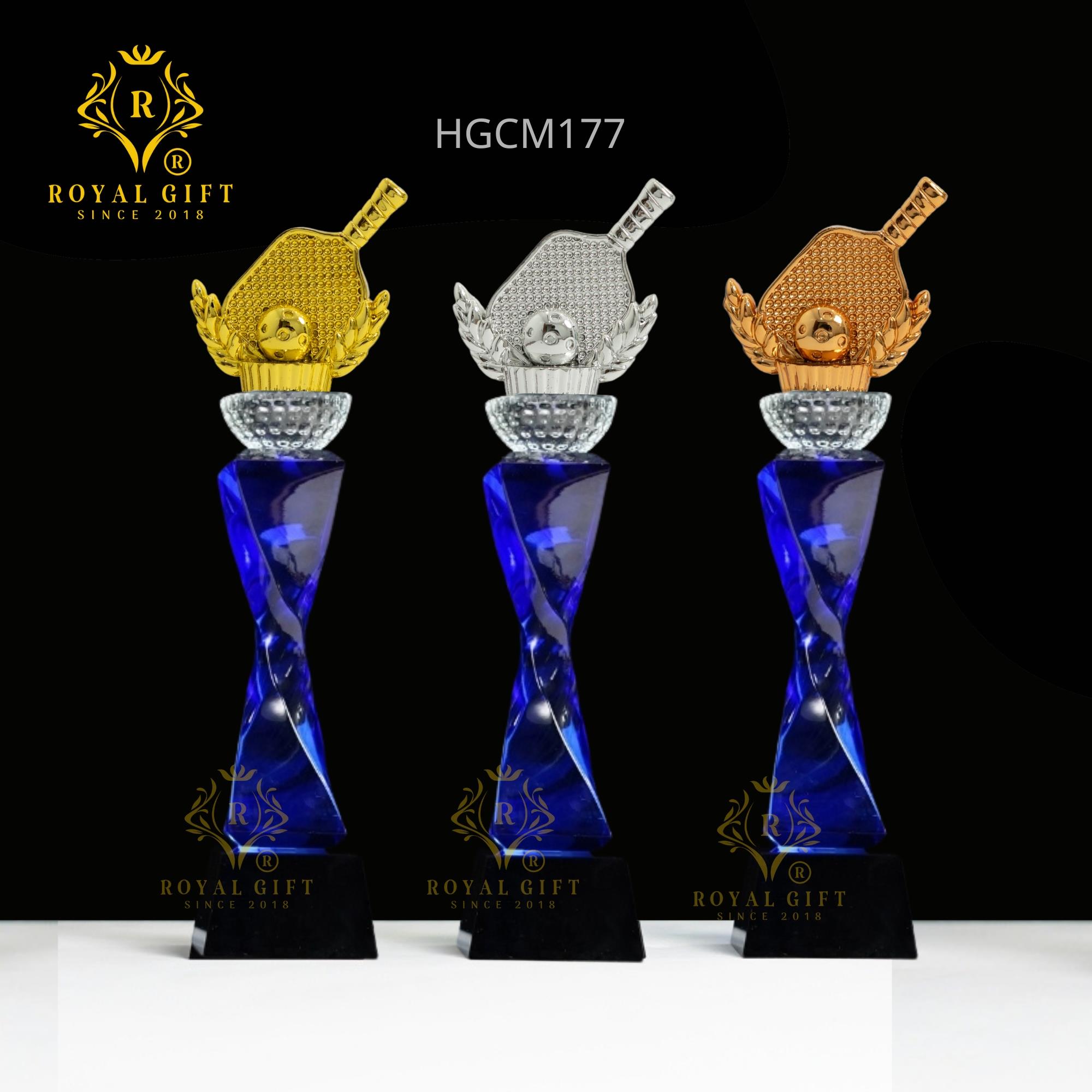 Cup pha lê K9 cao cấp HGCM177 được chế tác từ pha lê K9 sáng bóng, mang lại vẻ đẹp lấp lánh và sang trọng. Đỉnh cup được thiết kế hình vợt pickleball làm từ kim loại cao cấp không gỉ, tạo nên sự độc đáo và ấn tượng. Thân cup được chế tạo như một khối pha lê có màu xanh dương đậm, làm nổi bật sự tinh tế và đẳng cấp.