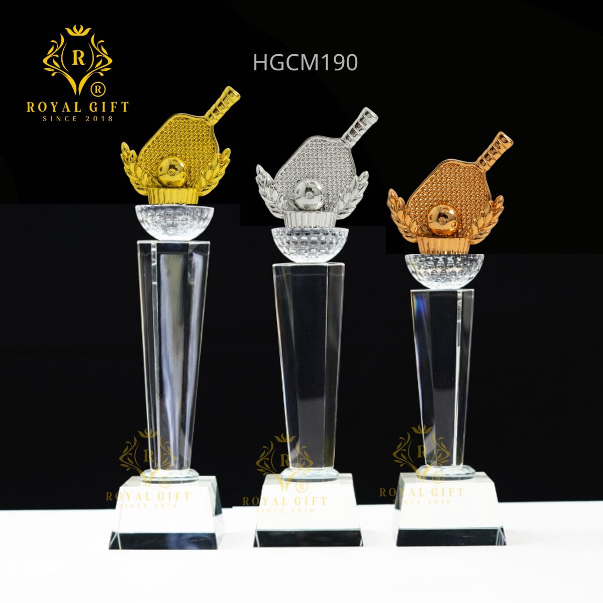 Cup pha lê K9 cao cấp HGCM190 được chế tác tỉ mỉ từ pha lê K9 sáng bóng, mang lại vẻ đẹp lấp lánh và sang trọng. Đỉnh cup là vợt pickleball được làm từ kim loại cao cấp không gỉ, tạo nên sự kết hợp hoàn hảo giữa chất liệu và thiết kế. Thân cup được tạo hình như khối pha lê đen, mang đến sự mạnh mẽ và cuốn hút. Đặc biệt, điểm nhấn giữa đỉnh và thân cup là nửa viên kim cương sáng bóng, làm tăng thêm giá trị thẩm mỹ và sự sang trọng cho sản phẩm.