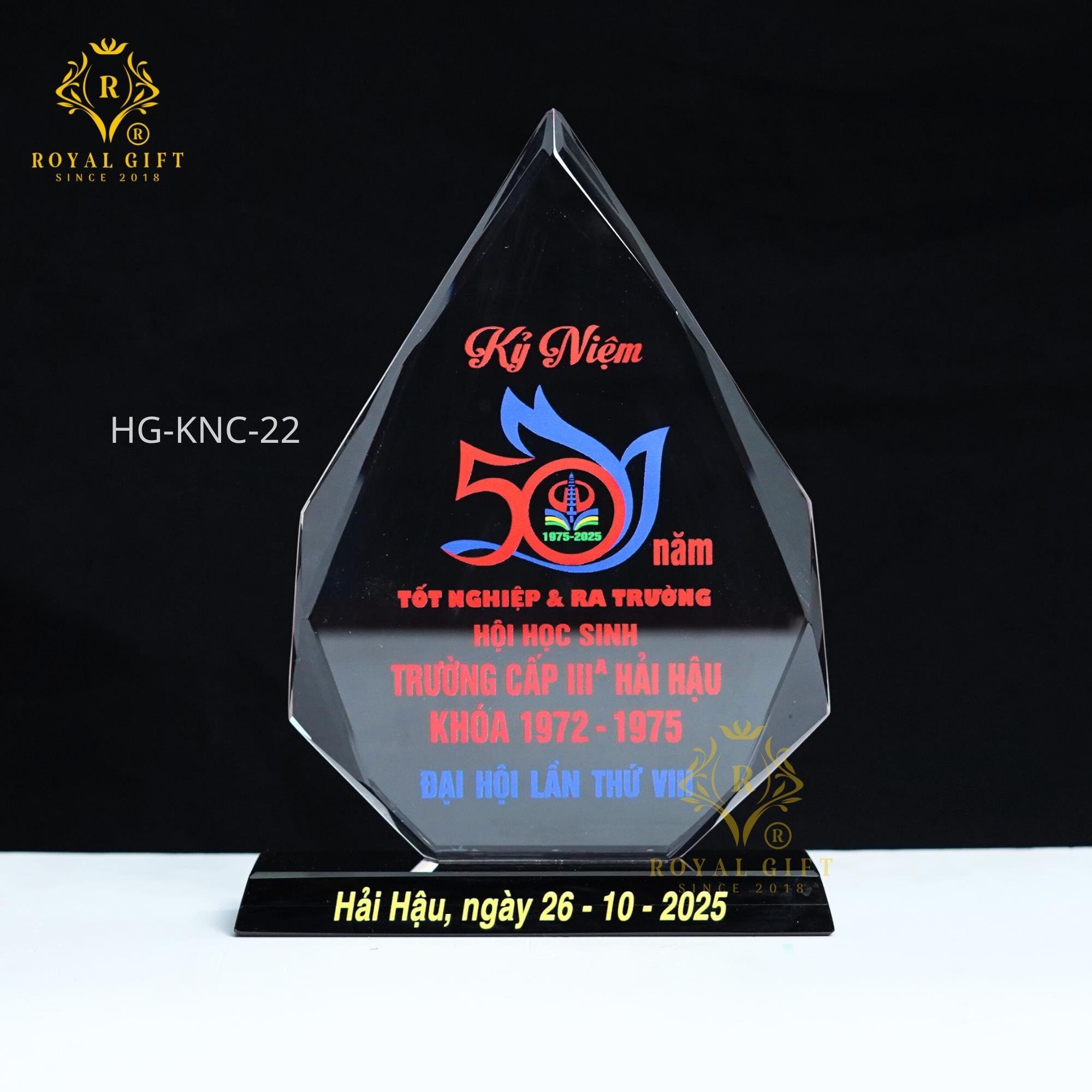 Kỷ niệm chương vinh danh pha lê cao cấp HG - KNC - 22 được thiết kế với hình kim cương vát canh độc đáo, mang lại vẻ đẹp nổi bật và sang trọng. Chất liệu pha lê K9 không chỉ có độ trong suốt tuyệt vời mà còn thể hiện sự cao cấp, giúp sản phẩm trở thành món quà lý tưởng cho những dịp đặc biệt.
